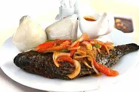 Banku and Tilapia is a beloved Ghanaian dish. Banku is a staple food made from fermented corn and cassava dough. It has a slightly sour taste and is usually served in a ball-like shape. Tilapia, a freshwater fish, is often seasoned and grilled or fried to a crispy perfection. The combination of the soft, doughy Banku with the crispy and flavorful Tilapia creates a harmonious contrast in taste and texture. The dish is commonly served with a spicy pepper sauce or a side of vegetables. It’s a popular dish in Ghana and other West African countries.