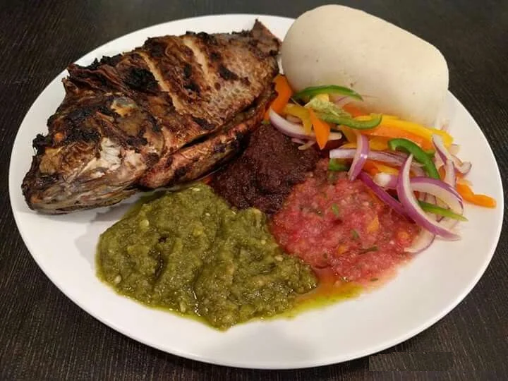 Banku and Tilapia is a beloved Ghanaian dish. Banku is a staple food made from fermented corn and cassava dough. It has a slightly sour taste and is usually served in a ball-like shape. Tilapia, a freshwater fish, is often seasoned and grilled or fried to a crispy perfection. The combination of the soft, doughy Banku with the crispy and flavorful Tilapia creates a harmonious contrast in taste and texture. The dish is commonly served with a spicy pepper sauce or a side of vegetables. It’s a popular dish in Ghana and other West African countries.